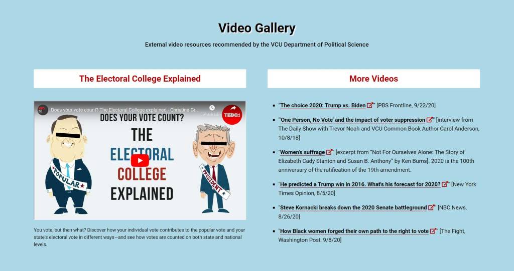Work with the chairs of the VCU Department of Political Science and the Robertson School of Media and Culture to create and launch a new section of the VCU College of Humanities and Sciences site devoted to voter education and resources for the upcoming local and federal elections.